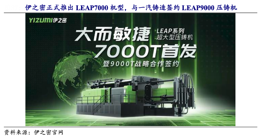 經(jīng)典案例:根據(jù)伊之密官網(wǎng)、開源證券研究所等綜合資訊表明,2022 年,伊之密公司正式推出 LEAP7000 機型,該款產品采用高剛性、高效穩(wěn)定的鎖模系統(tǒng),可確保大型薄壁零件的高動態(tài)填充能力,更好地滿足新能源汽車超大型一體化壓鑄 件的工藝要求,同時公司與一汽鑄造簽約 LEAP9000 壓鑄機,此款壓 鑄機是為一汽新能源汽車的后地板超大型壓鑄件量身打造,外圍尺寸約為 1850X1500X800, 是目前市場上尺寸最大的壓鑄件。