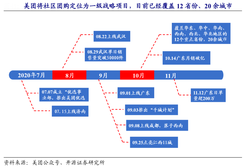 經(jīng)典案例:根據(jù)美團(tuán)公眾號、開源證券研究所等綜合資訊表明,2020 年 9 月,美團(tuán)優(yōu)選宣布推出“千城計(jì)劃”,旨在年 底前實(shí)現(xiàn)全國覆蓋,并逐步下沉至縣級市場。截至2020年10月份,美團(tuán)優(yōu)選已覆蓋華東、 華中、華南、西南、西北、華北等地區(qū)的 12 個(gè)重點(diǎn)省份、20 余城市。