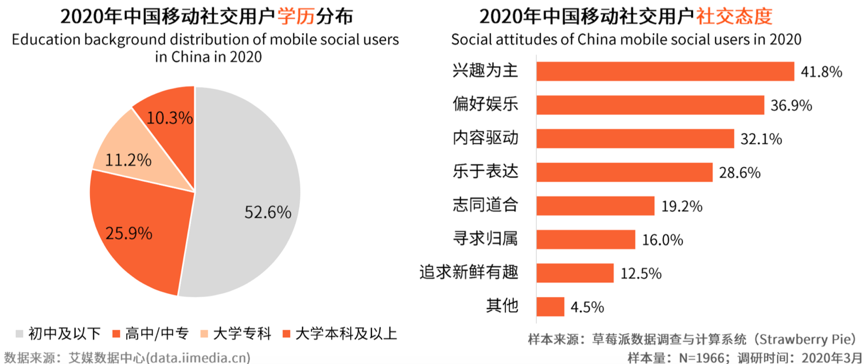 “同道者”美美與共,共同發(fā)展,“興趣相似”日益成為用戶社群集合經(jīng)營的強大指引。根據(jù)艾媒數(shù)據(jù)中心等綜合資訊表明,超五成用戶學歷在初中(52.6%)及以上,注重興趣匹配,強化興趣為主(41.8%)、偏好娛樂(36.9%)、內(nèi)容驅(qū)動(32.1%)。