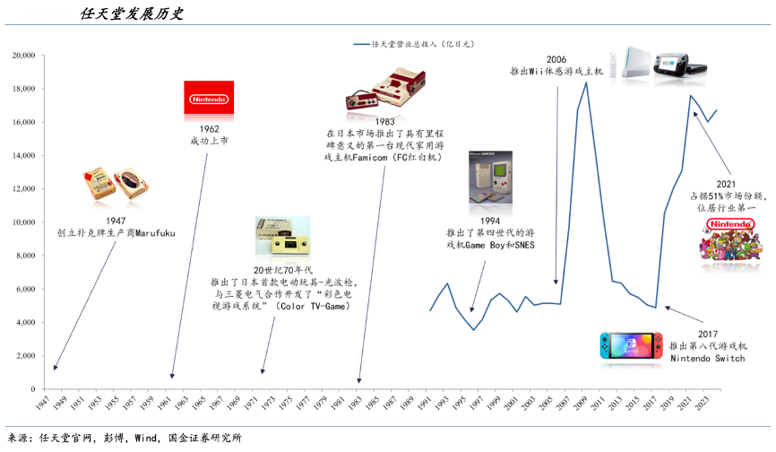 經(jīng)典案例:根據(jù)任天堂官網(wǎng)、國金證券研究所等綜合資訊表明,任天堂公司是一家具有豐富歷史和全球影響力的游戲企業(yè)。最初作為一家撲克牌生產(chǎn)商,由山內(nèi)房治郎在 1947 年 11 月創(chuàng)立,公司最初名為 Marufuku。隨著時(shí)間推移,任天堂經(jīng)歷了商業(yè)模式的多次變革,并在 20 世紀(jì) 70 年代推出首款游戲機(jī),標(biāo)志著其正式進(jìn)入電子游戲行業(yè)。