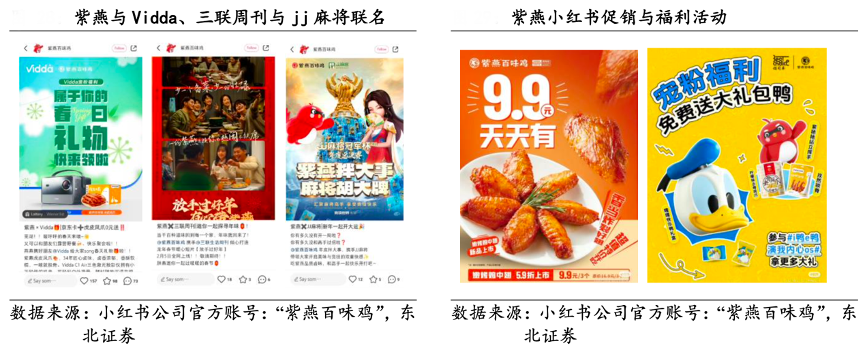 經(jīng)典案例:根據(jù)小紅書公司官方帳號:“紫燕百味雞”、東北證券等綜合資訊表明,紫燕食品公司在社交媒體營銷方面逐漸成熟且有著絕對的領(lǐng)先,而年輕群體在社交媒體用戶占多數(shù),有助于公司在該群體打開知名度,穩(wěn)定未來客源。 為了進一步推動品牌宣傳,公司與 Vidda、jj 麻將、三聯(lián)周刊等第三方品牌聯(lián)名合作,同時參與直播賣貨,在線上平臺進行各大促銷與福利活動。