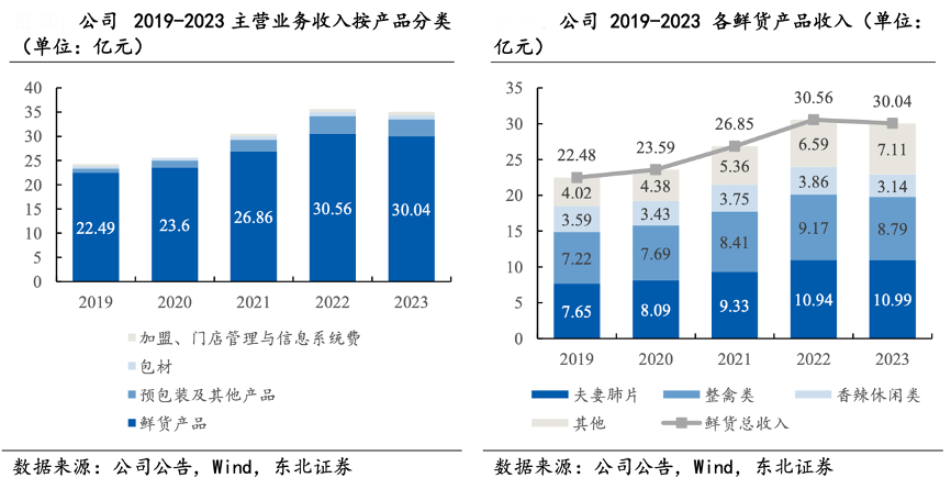 經(jīng)典案例:根據(jù)公司公告、wind、東北證券等綜合資訊表明,紫燕食品公司以塑造“大單品”與“爆品”為目標,推出多種新品,如:酸湯肥牛、冷吃千層肚、樂山缽缽雞、藤椒板鴨等。鮮貨產(chǎn)品的 2019/2020/2021/2022/2023 年的營業(yè)收入為 22.49/23.60/26.86/30.56/ 30.04 億 元,CAGR 為+7.52%,由 22.49 億元漲至 30.04 億元,上漲幅度基本與公司主營收入 呈正比。