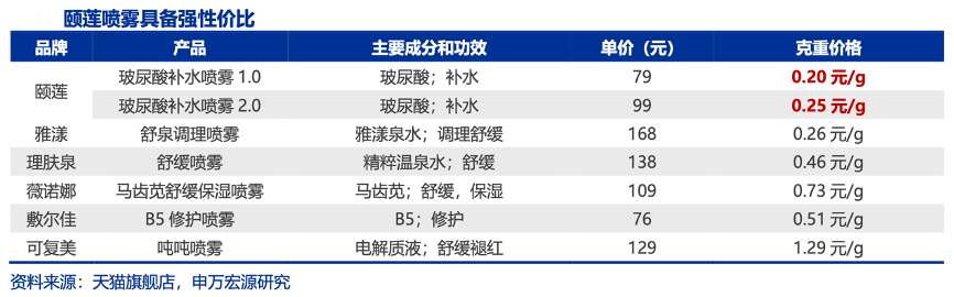 經(jīng)典案例:根據(jù)天貓旗艦店、申萬(wàn)宏源研究等綜合資訊表明,頤蓮品牌創(chuàng)建于 2003 年,專注“玻尿酸護(hù)膚”二十載,產(chǎn)品價(jià)格親民實(shí)惠,其中頤蓮玻尿酸補(bǔ)水噴霧以 0.20 元/g 的超高性價(jià)比,長(zhǎng)效保濕、方便攜帶、使用場(chǎng)景廣泛、包裝鎖鮮等優(yōu)勢(shì),天貓總銷量超過(guò) 5000 萬(wàn)瓶,帶動(dòng)其他產(chǎn)品順利出圈,玻尿酸精華面膜、玻尿酸分體面膜在天貓總銷量均突破 50 萬(wàn)件。