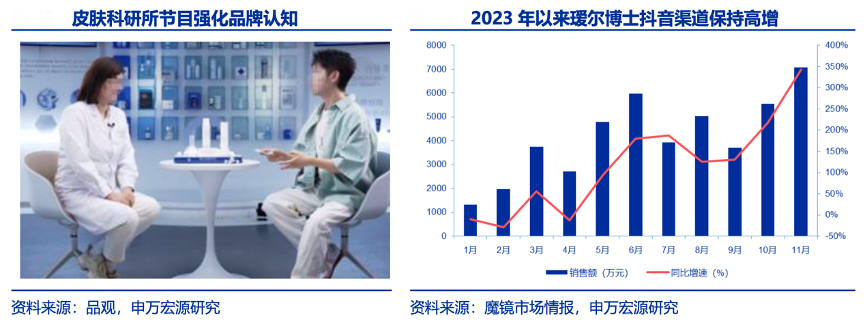 經(jīng)典案例:根據(jù)品觀、魔鏡市場(chǎng)情報(bào)、申萬(wàn)宏源研究等綜合資訊表明,在微生態(tài)護(hù)膚的心智搭建上,璦爾博士在《皮膚的真相》《專家請(qǐng)指教》 《皮膚科研所》系列短視頻中,邀請(qǐng)上海市皮膚病醫(yī)院專家鄒穎、重慶醫(yī)科大學(xué)附屬第一 醫(yī)院皮膚陳瑾教授、知名 KOL 楊若天、璦爾博士首席研發(fā)師李燕等專家、科研人員走到臺(tái) 前,直面消費(fèi)者需求,實(shí)現(xiàn)營(yíng)銷和科普的“跨界融合”。在專家+達(dá)人的 線上營(yíng)銷體系下,自 2023 年下半年開始,璦爾博士抖音渠道銷售額連續(xù)保持三位數(shù)高速增 長(zhǎng)。
