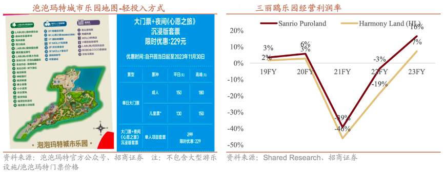 經(jīng)典案例:根據(jù)泡泡瑪特官方公眾號(hào)、Shared Research、招商證券等綜合資訊表明,泡泡瑪特樂園采用輕投入的方式。泡泡瑪特城市樂園 2023 年 9 月 26 日在北京 朝陽公園開業(yè),面積為 4 萬平方米,初始投入 3 億元。收入來源包括門票和入園的二次消費(fèi),園內(nèi)沒有大型的游樂設(shè)施。成人票根據(jù)項(xiàng)目不同在 150-299 元之間。
