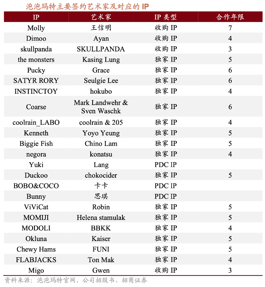 經(jīng)典案例:根據(jù)泡泡瑪特官方、公司招股書、招商證券等綜合資訊表明,泡泡瑪特憑借先發(fā)優(yōu)勢(shì),與行業(yè)眾多知名藝術(shù)家保持合作。目前泡泡瑪特有 26 位簽約藝術(shù)家。公司簽約的多位藝術(shù)家在潮玩領(lǐng)域有較大的影響力。例如,王信明在 2022 國際潮流藝術(shù)家影響力排行榜排名 37,位于中國第一名; Kasing Lung 是 全球首位榮獲比利時(shí)出版社插畫大獎(jiǎng)的華人插畫家,和藝術(shù)家的合作為公司提供 豐富的 IP 矩陣的同時(shí),也能幫助吸引部分粉絲群體。