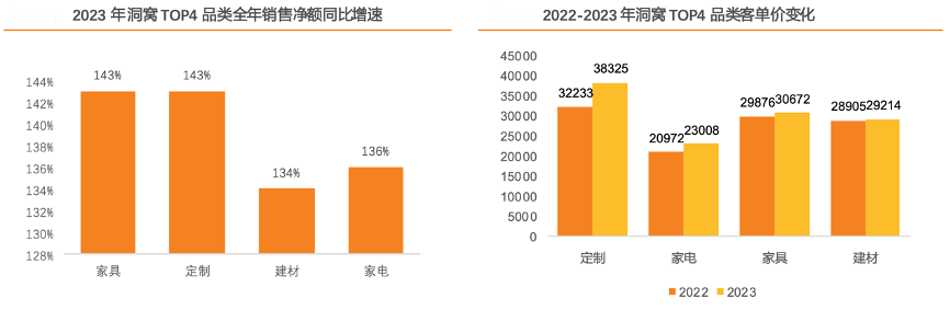 經(jīng)典案例:根據(jù)公司年報(bào)、天風(fēng)證券研究所等綜合資訊表明, 2022-2023 年洞窩整體銷售凈額從 346 億元提升至 974 億元,主要得益于洞窩廣泛滲透以及用戶規(guī)模和商品豐富度快速提升。拆分量價(jià)來看,2022-2023 年洞窩客單價(jià)從 3.7 萬元提升至 4.1 萬元、客單量從 2.4 單提升 至 2.6 單,均增長約 10%,主要系憑借線上線下相結(jié)合的新購物場景帶來了服務(wù)體驗(yàn)升級。