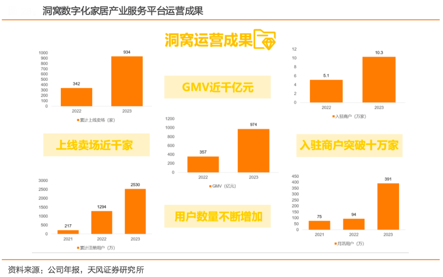 經(jīng)典案例:根據(jù)居然之家洞窩數(shù)據(jù)、艾瑞咨詢、公眾號家居新范式、天風(fēng)證券研究所等綜合資訊表明,洞窩成立于2020 年12月,依托居然之家的產(chǎn)業(yè)背景 和平臺資源打造 ,通過聚焦產(chǎn) 業(yè)鏈上 下游的 數(shù)字化 賦能、線 上線下 一體化 全場景 零售、跨 境電商三大核心業(yè)務(wù),全鏈路賦能品 牌工廠 、經(jīng)銷 商和賣場。截至 2023 年底洞窩累計(jì)上線賣場已達(dá) 934 家,同比增長 173.1%;入駐商戶超過 10 萬家。