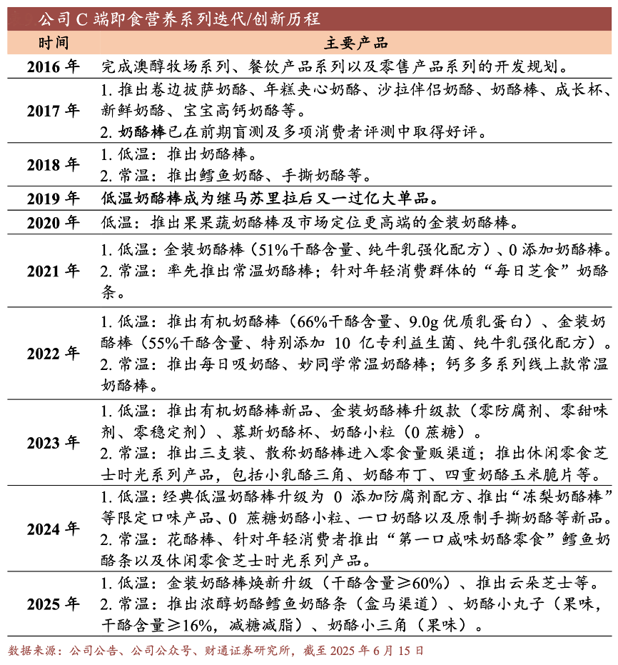 經(jīng)典案例:根據(jù)公司公告、公司公眾號(hào)、財(cái)通證券研究所等綜合資訊表明,妙可藍(lán)多公司依托業(yè)內(nèi)領(lǐng)先的研發(fā)能力,實(shí)現(xiàn)奶酪產(chǎn)品的持續(xù)迭代升級(jí)。自 2018 年低溫奶酪棒上市以來,公司針對(duì)奶酪棒的口味、營養(yǎng)、干酪含量等各維度不斷迭代升級(jí),陸續(xù)推出了零添加金裝奶酪棒、高鈣奶酪棒、奇炫奶酪棒等升級(jí)品類,并于 2021 年推出常溫奶酪棒,拓寬了奶酪棒產(chǎn)品的渠道和消費(fèi)場景。