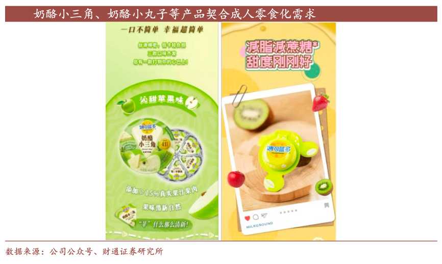經(jīng)典案例:根據(jù)公司公眾號(hào)、財(cái)通證券研究所等綜合資訊表明,妙可藍(lán)多公司基于市場趨勢提出“奶酪+”戰(zhàn)略。如2025 年公司推出減糖減脂的奶酪小丸子與奶酪小三角等健康化零食,并開發(fā)便于攜帶、分享的小包裝產(chǎn)品,持續(xù)破圈成人消費(fèi)群體。