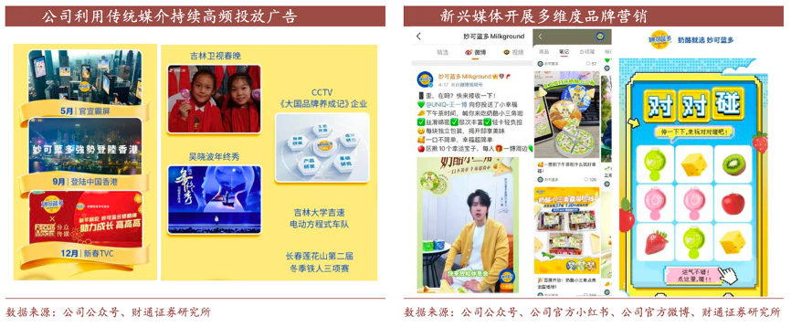 經(jīng)典案例:根據(jù)公司公眾號、公司官方小紅書、公司官方微博、財(cái)通證券研究所等綜合資訊表明,妙可藍(lán)多公司早期采取“高舉高打”營銷策略,憑借快速、精準(zhǔn)、高頻的打法讓“奶酪就選妙可藍(lán)多”的品牌價(jià)值訴求深入人心。新興媒體方面,公司利用小紅書、抖音、 微博等社交媒體平臺發(fā)布多維場景化內(nèi)容,并與網(wǎng)絡(luò)達(dá)人合作開展品牌宣傳、與 消費(fèi)者積極互動,鞏固品牌認(rèn)知。