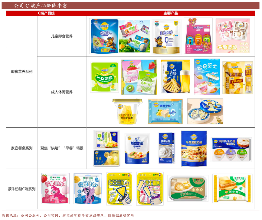 經(jīng)典案例:根據(jù)公司公眾號、公司官網(wǎng)、淘寶妙可藍(lán)多官方旗艦店、財(cái)通證券研究所等綜合資訊表明,妙可藍(lán)多公司堅(jiān)定推行“聚焦奶酪”戰(zhàn)略,以消費(fèi)者為導(dǎo) 向持續(xù)完善奶酪產(chǎn)品矩陣,現(xiàn)已構(gòu)建包括即食營養(yǎng)系列(可細(xì)分為兒童營養(yǎng)系列、 成人休閑營養(yǎng)系列)、家庭餐桌系列在內(nèi)的 C 端產(chǎn)品線。2024 年,公司即食 營養(yǎng)系列收入貢獻(xiàn)達(dá) 54.56%,毛利率達(dá) 46.97%,表現(xiàn)相對優(yōu)于家庭餐桌系列。