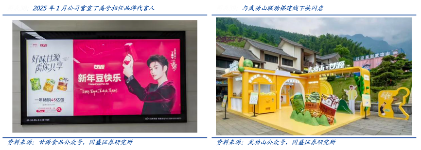 經(jīng)典案例:根據(jù)甘源食品公眾號、武功山公眾號、國盛證券研究所等綜合資訊表明,2025年1月甘源公司官宣丁禹兮擔任品牌代言人,春節(jié)期間定制代言人禮盒,搭配贈送明星獨家周邊。同時開展一系列品宣活動,線下聯(lián)合老婆 大人打造定制陳列,組織主題門店打卡活動。此外借助萍鄉(xiāng)旅游優(yōu)勢,與武功山聯(lián)名搭建線下快閃店,打卡贈送冰激凌,并沿線投放宣傳物料,實現(xiàn)吃喝玩樂巧妙互動。