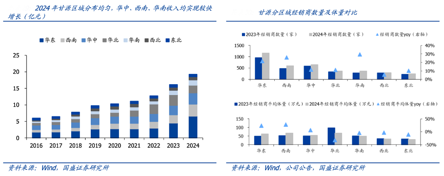 經(jīng)典案例:根據(jù)wind、公司公告、國盛證券研究所等綜合資訊表明,甘源公司線下經(jīng)銷團隊擴容,推動營收高增長。從區(qū)域來看,2024 年公司華東/西南/華中/華北/ 華南/西北/東北分別實現(xiàn)收入 6.6/3.7/3.4/2.3/1.6/1.0/0.7 億元,2020-2024 年 CAGR 分 別為 24.2%/21.9%/12.2%/18.5%/14.0%/1.3%/0.6%。