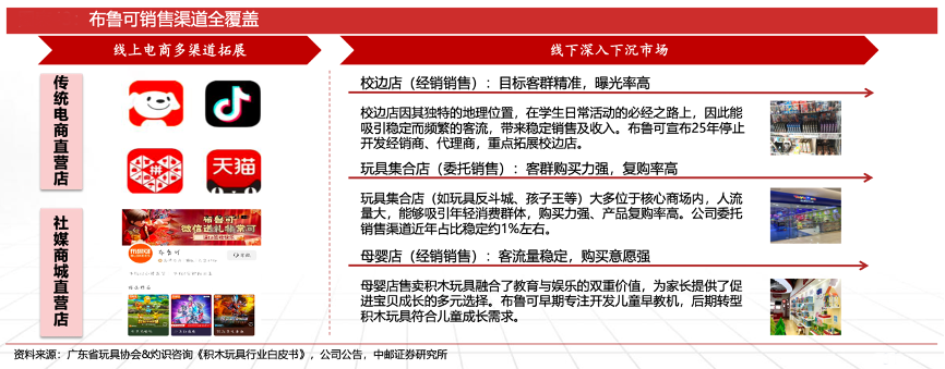 經典案例:根據廣東省玩具協(xié)會&灼識咨詢《積木玩具行業(yè)白皮書》、公司公告、中郵證券研究所等綜合資訊表明,布魯可線上直營收入約占整體收入7%,未來線上仍以做私域為主,慮以旗艦店的形式開啟線下自營模式。