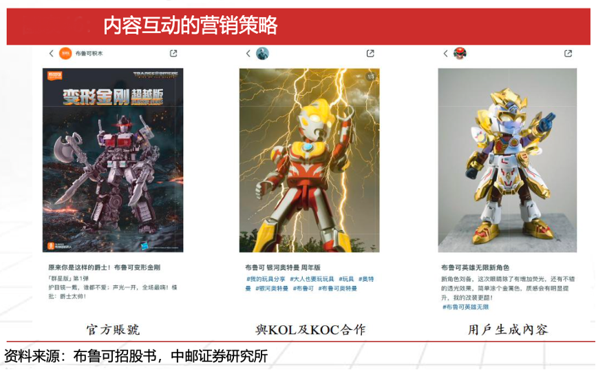 經典案例:根據布魯可招股書、中郵證券研究所等綜合資訊表明,布魯可區(qū)別于傳統(tǒng)玩具,拼搭玩法所決定的消費者互動性和情感投入、角色類 IP自帶的豐富內容屬性和易傳播性,其主要采用官方賬號(觸達具備更強粘性的老粉絲)、與KOL及KOC合作(觸達新用戶和 提升品牌知名度)、用戶生成內容(鼓勵用戶分享、擴大影響力、滿足社交需求)三大傳播渠道,受眾廣泛。2023及2024年內合作的KOL和KOC全 網粉絲數(shù)達2.40億,于2023年9月啟動的視頻分享活動中單個視頻累計播放量最高超過 64 萬次。