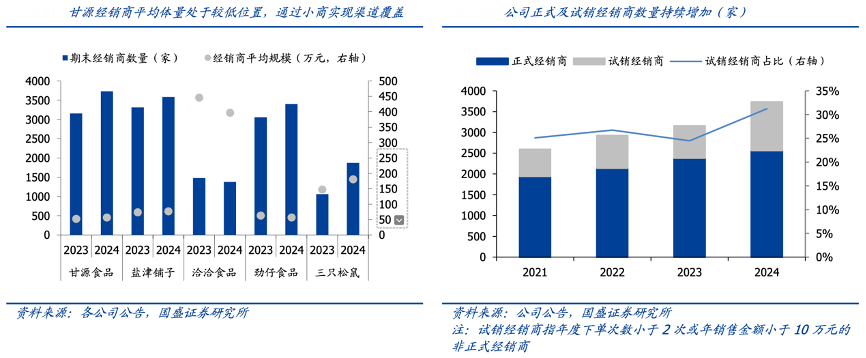 經(jīng)典案例:根據(jù)各公司公告、國盛證券研究所等綜合資訊表明,甘源橫向?qū)Ρ瓤矗试唇?jīng)銷商數(shù)量處于行業(yè)相對高位, 但經(jīng)銷商平均體量處于較低水位,預(yù)計(jì)與甘源過去大單品集中度較高,以及渠道覆蓋度 寬幅密切相關(guān)。從渠道維度看,公司更加精耕運(yùn)營,招募代言人提升品牌聲量,且持續(xù)招 募新經(jīng)銷商,正式經(jīng)銷商及試銷經(jīng)銷商數(shù)量持續(xù)提升,側(cè)面印證市場覆蓋度逐步增加, 對潛力區(qū)域及空白市場的下沉更進(jìn)一步。